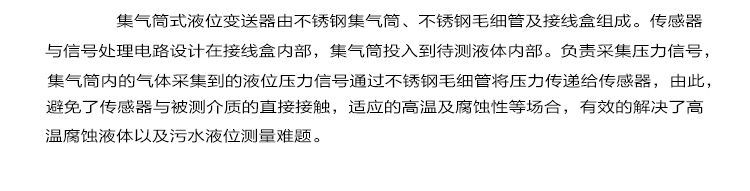 集氣桶式液位變送器(下稱變送器)用于測量較高溫度液體介質的液位,原理是被測液體介質壓縮集氣桶內的空氣,空氣壓力通過毛細管傳遞給敏感元件,敏感元件本身不與被測介質直接接觸,因此變送器可以應用在較高溫度的介質環境中,同時,內置微型信號放大處理電路,可以直接與計算機接口卡、控制儀表、智能儀表或 PLC 等連接,進行遠程傳輸。變送器廣泛應用于環保、水利、供水、工業過程控制、變頻供水等較高溫度介質的液位測量。CN2